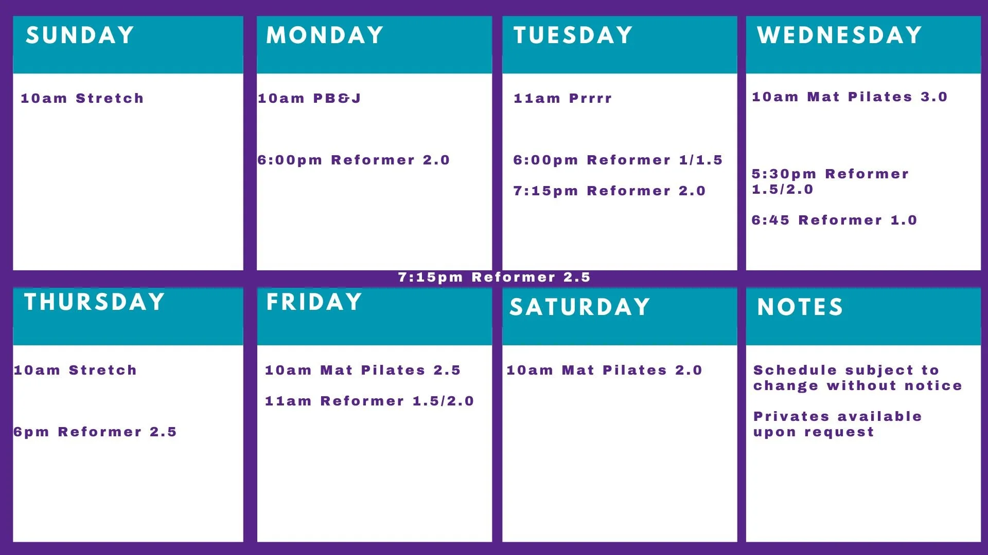 Mat-based classes (mat Pilates, stretch, PB&J, & PRRR) are available on a drop-in basis, or with the purchase of a class package.